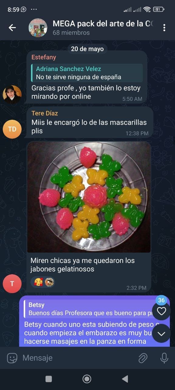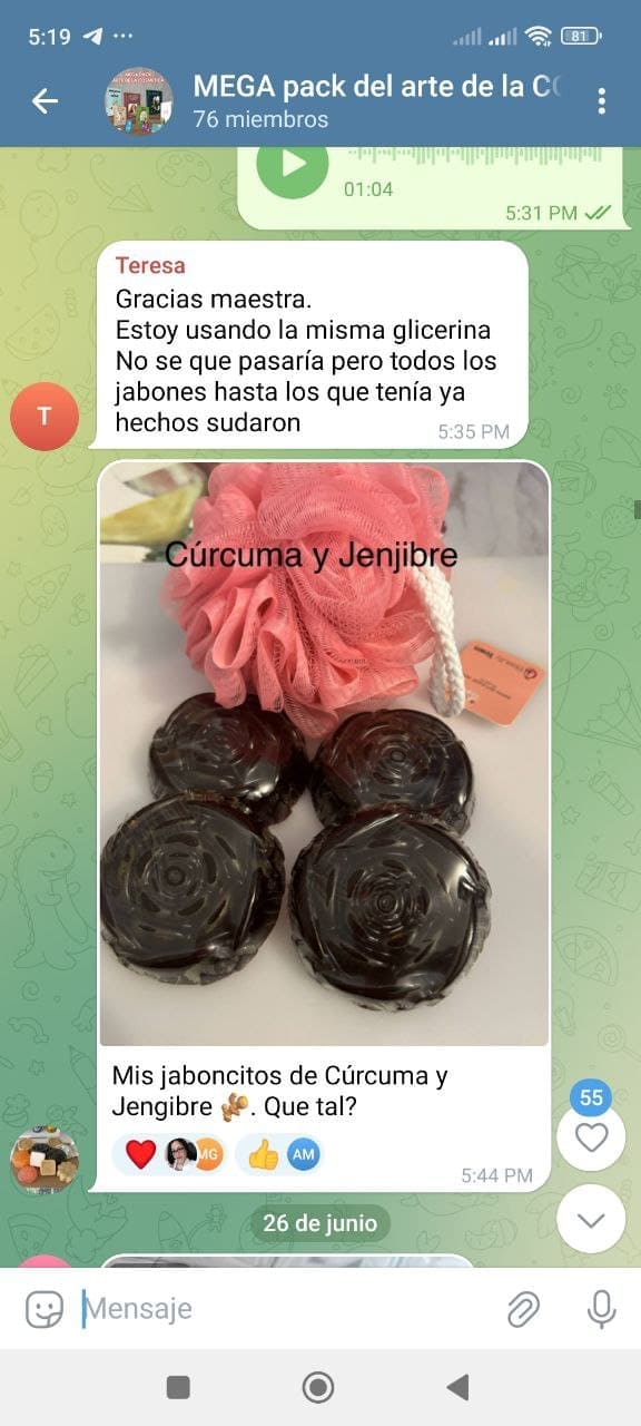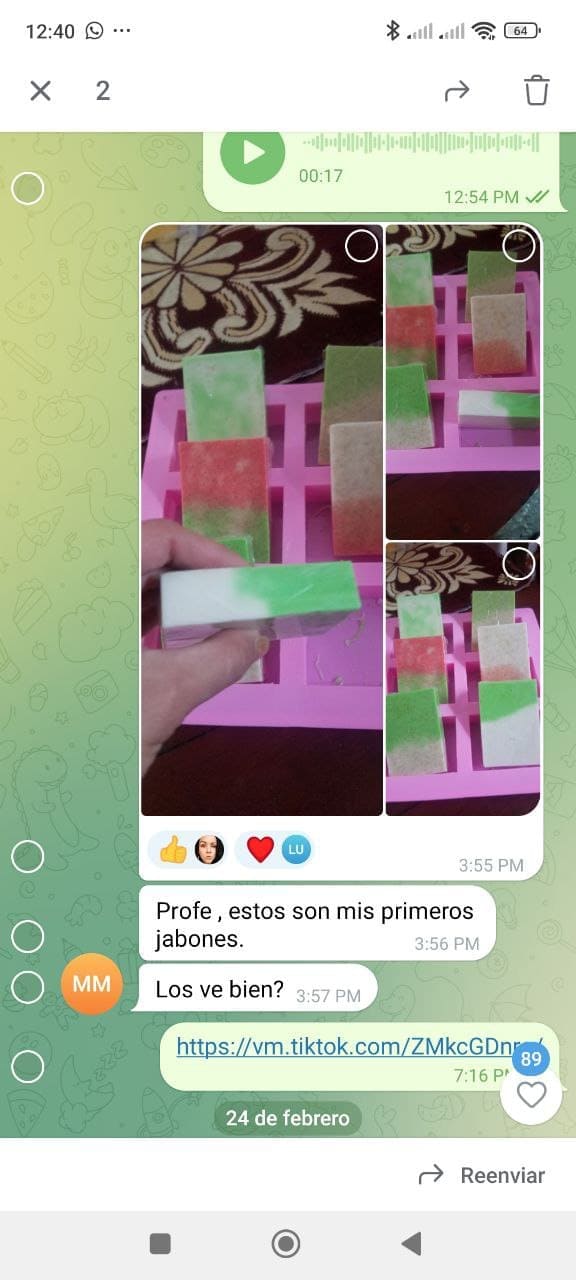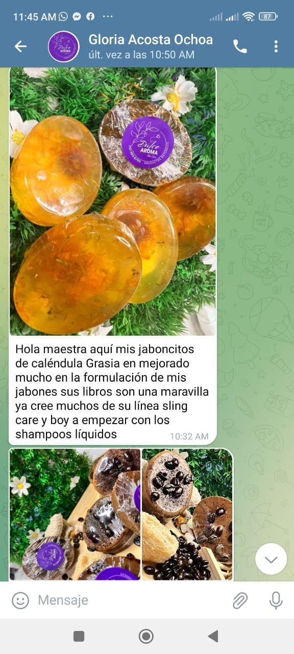 Durante mucho tiempo he asistido a varias capacitaciones y talleres mejorando y actualizando las técnicas, desempeñando mejor acabado, presentación, diseño e incorporando ingredientes en beneficios en la nutrición de nuestra piel, a la vez en unión de un grupo de mujeres emprendedoras se está llevando una microempresa para mejorar la economía a familias vulnerables en una comunidad de Ecuador la cual se les ha capacitado teniendo buenos resultados.